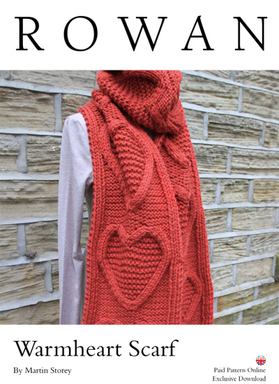 Warmheart Scarf (Digital Download) Knit this super long accessory scarf designed exclusively for Knitrowan by Martin Storey. Using one of our most popular yarns Big Wool (wool), this scarf features cabled hearts with garter stitch in the centre and a reverse stocking stitch background.