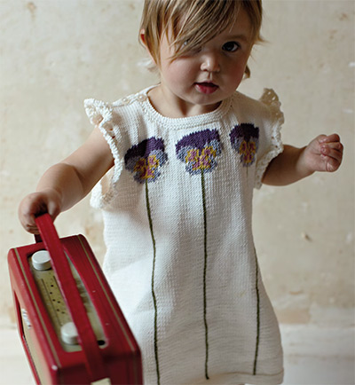 Nora Childrens Intarsia Dress (Digital Download) Knit this childrens intarsia dress, a design from the Rowan archive that is now available to purchase online. Designed by Grace Melville, we would suggest using our beautiful soft matt cotton yarn Summerlite 4ply (cotton), this pretty dress has an eye catching, intarsia flower motif, ruffle sleeves and garter stitch edgings.