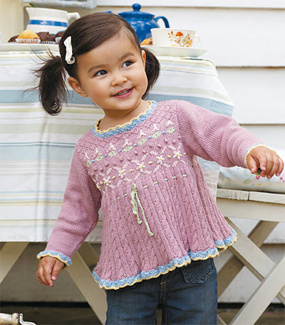Princess Childrens Sweater (Digital Download) Knit this childrens adorable round neck sweater, a design from the Rowan archive that is now available to purchase online. Designed by Marie Wallin, we would suggest using our beautiful soft matt cotton yarn Summerlite 4ply (cotton), this sweater has an embroidered top secion, cabled bottom section and is finished with a crocheted trim.