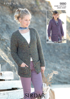 9880 - V Neck Cardigan and Shawl Collared Cardigan using Freya Leaflet with designs for a V Neck Cardigan and Shawl Collared Cardigan using Sirdar Freya.