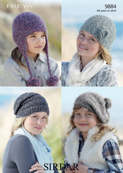 9884 - Tam 'o' Shanter, Slouchy Hat, Helmet and Pull-on-Hat using Freya Leaflet with designs for a Tam 'o' Shanter, Slouchy Hat, Helmet and Pull-on-Hat using Sirdar Freya.