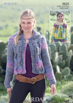 9820 - Round Neck Cardigan and Hooded Cardigan using Indie Leaflet with designs for a Round Neck Cardigan and Hooded Cardigan using Sirdar Indie.
