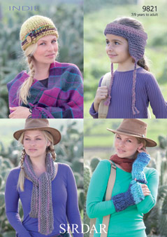 9821 - Hat, Headwarmer, Fingerless Mittens and Scarf using Indie Leaflet with designs for a Hat, Headwarmer, Fingerless Mittens and Scarf using Sirdar Indie.