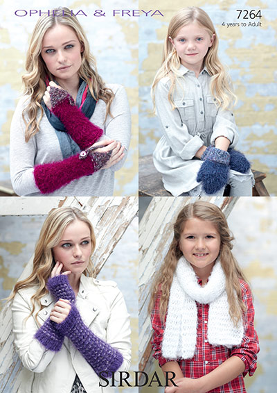 7264 - Gloves, Mittens and Scarf using Sirdar Ophelia Leaflet with designs for Gloves, Mittens and Scarf using Sirdar Ophelia.