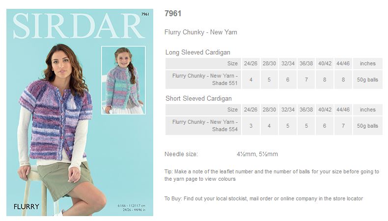 |  | | Yarn Type | SALE 30% OFF! Knits exactly to Sirdar Snowflake Chunky (but ball is 50g instead of 25g). A wonderfully soft and cosy yarn with a gorgeous fleecy texture. It comes in a range of turbo-dyed colour effect shades, these include soft, powdery colours, as well as stronger, more vibrant ones too. Flurry is the perfect yarn for creating the snuggest of knits for all the family and we have a gorgeous collection of designs with patterns for women, children and babies. Flurry Chunky is machine washable on a wool cycle.. 100% Polyester. Latest Patterns | | Needle Size | 5½mm/5UK/9US | Tension per 10cm (4 inches) | 14 sts x 19 rows | Length (per ball) | Approx. 124 metres (136 yards) per 50g ball | | Shade Card | No Shade Card Available |
