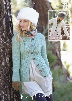 9394 - Round Neck Cardie and Shawl Collar Cardie using Hayfield Bonus Aran With Wool Leaflet with designs for a Round Neck Cardie and a Shawl Collar Cardie using Hayfield Bonus Aran With Wool.